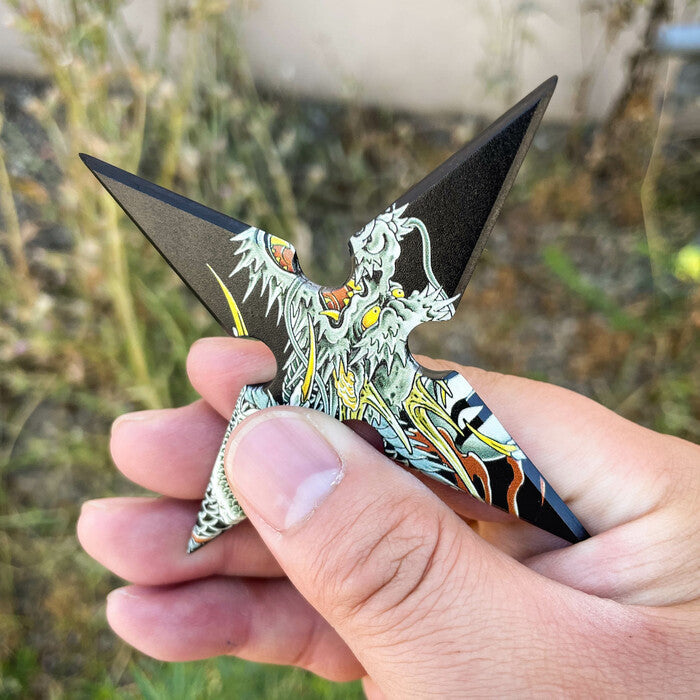 This throwing star measures 4 inches across and all points are ground to a sharp edge and tip. To make carrying the star easier, it comes with a black ninja throwing star case with a belt loop.